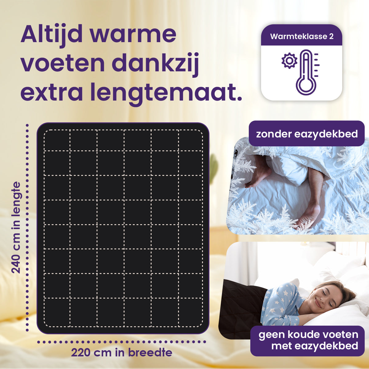 Dankzij de cassette stiksels blijft de vulling gelijkmatig verdeeld. Dit voorkomt koude plekken en zorgt voor een constante warmteverdeling. Met Warmteklasse 2 is het eazydekbed geschikt voor elk seizoen, zodat je altijd comfortabel slaapt.